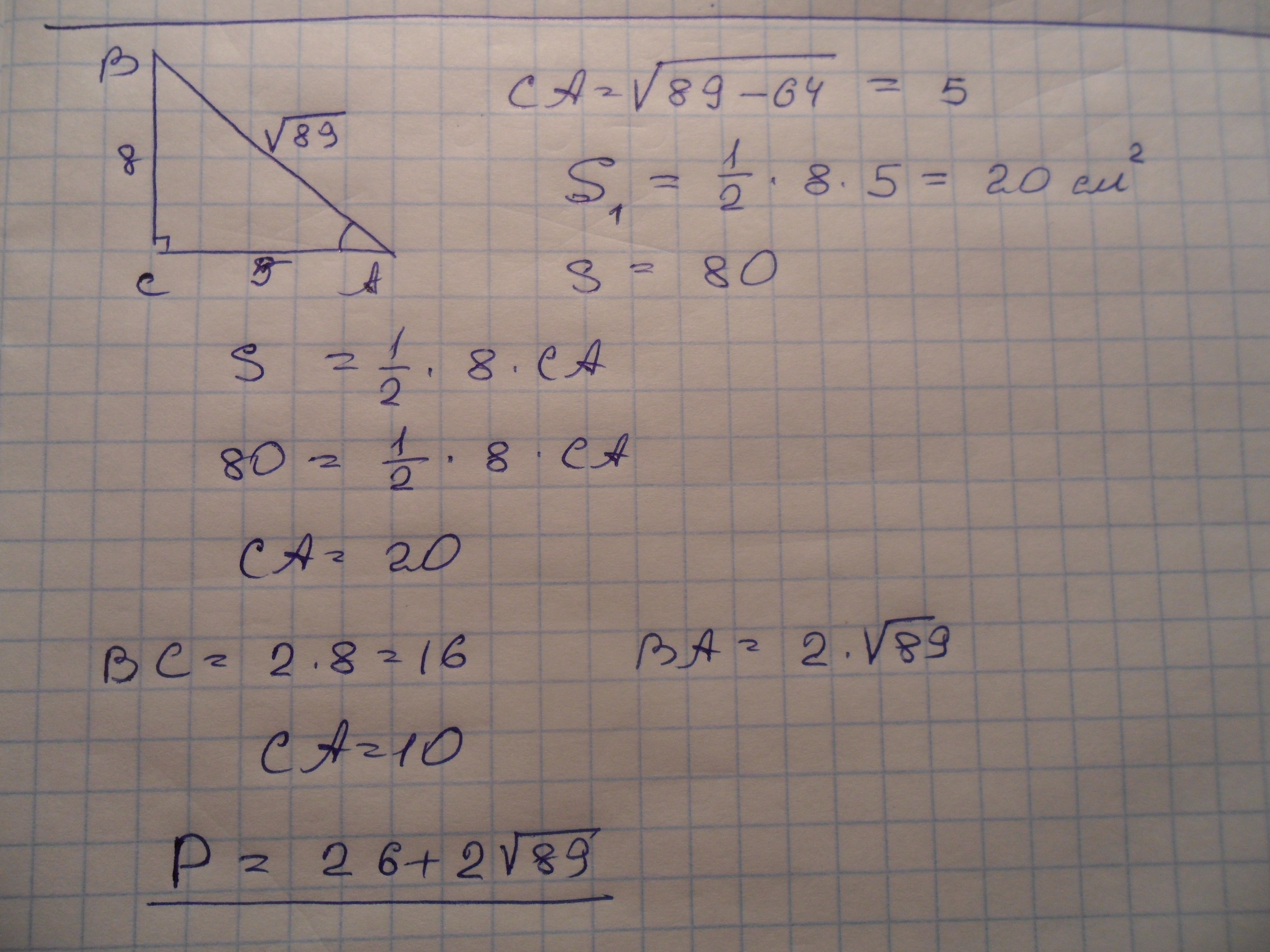 площадь прямоугольного треугольника равна 80, синус одного из острых углов равен 8/корень89. найти периметр треугольника