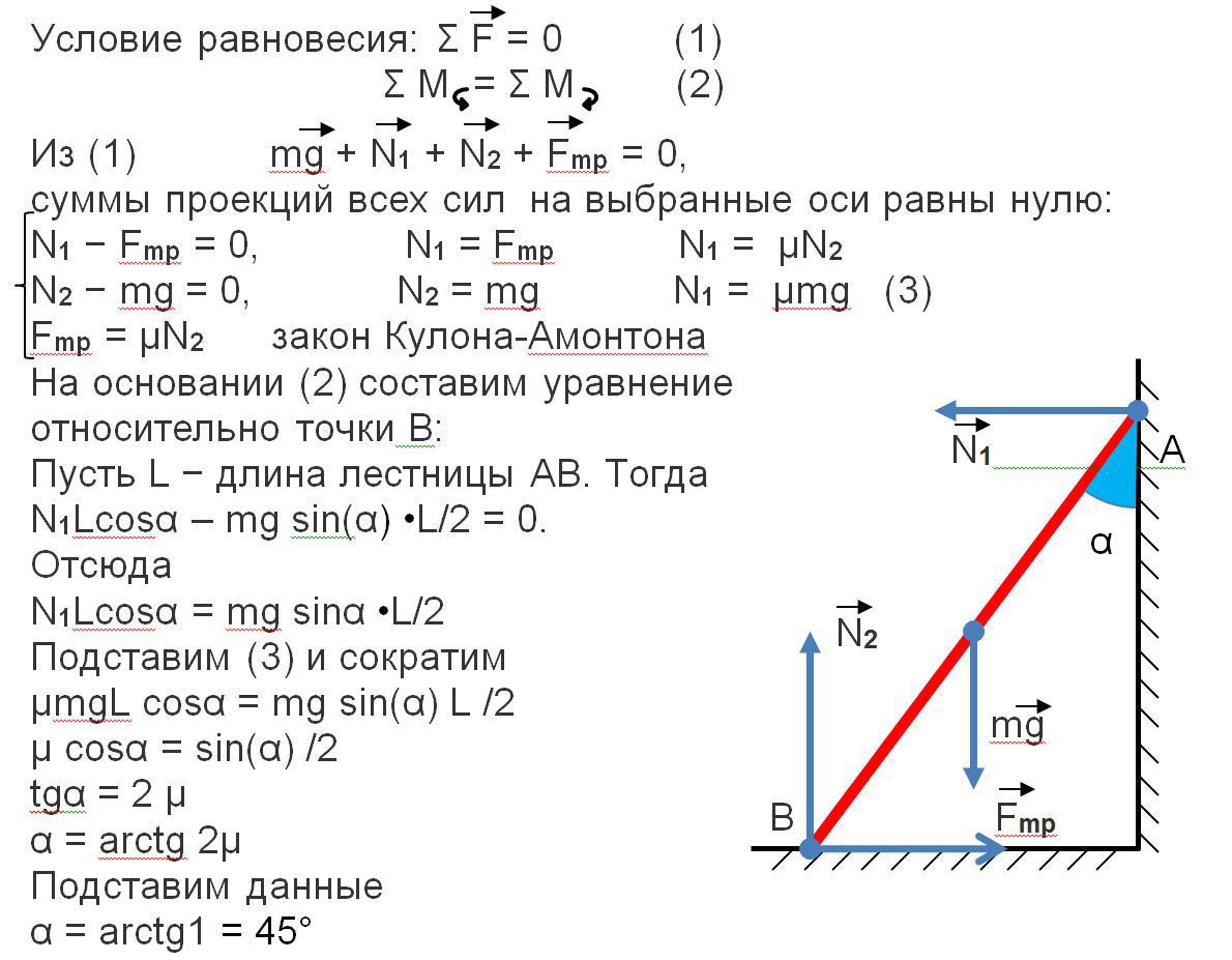 Под каким наибольшим углом (в градусах) к вертикали может стоять лестница, прислоненная к гладкой вертикальной стене, если коэффициент трения лестницы о пол 0,5? Центр тяжести лестницы находится в ее середине.