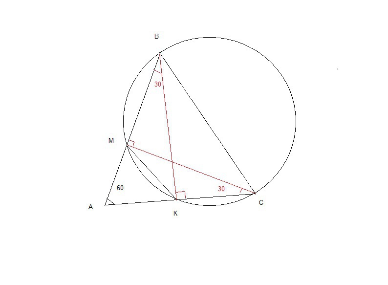 проведем ВК и СМ . Это будут высота, т.к. треугольники ВСК и ВМС вписаны в окр, ВС- диаметр, значит угол К и М прямой. а углы АВК и АСМ =30