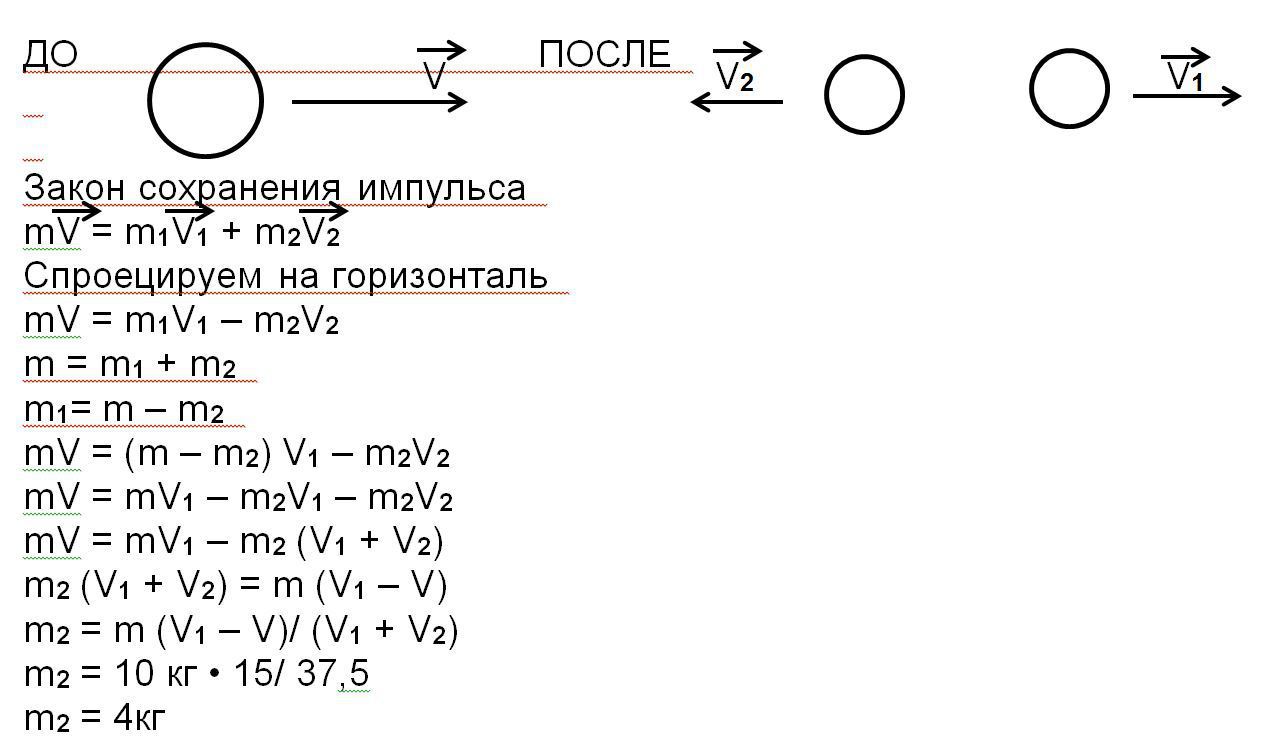 граната массой 10 кг летевшая со скоростью 10 м/с разорвалась на две части Скорость большого осколка равна 25 м/с направлена в сторону движения гранаты скорость меньшего осколка равна 12,5 м/с и направлена в противоположную сторону Найдите массу большего осколка Ответ представить в единицах си