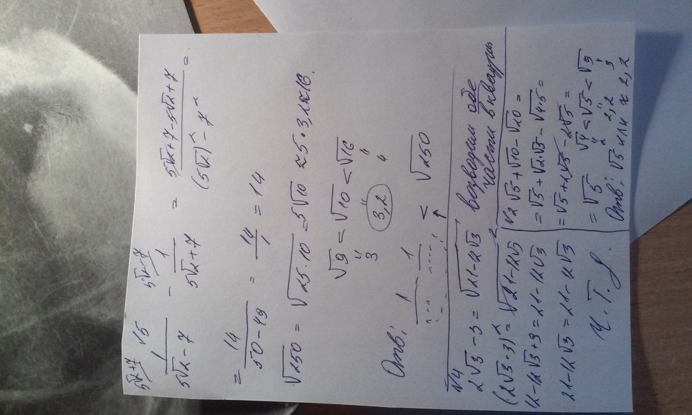 1. Числитель запишем там /3*9 - /3*7 - /3*5 <=> sqrt{3*9}-sqrt{3*7}-sqrt{3*5}/3-sqrt{7}-sqrt{5} выносим sqrt{3} за скобки <=>