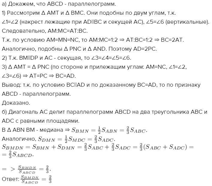 б) Найдите отношение площади четырёхугольника BMDN к площади параллелограмма ABCD.