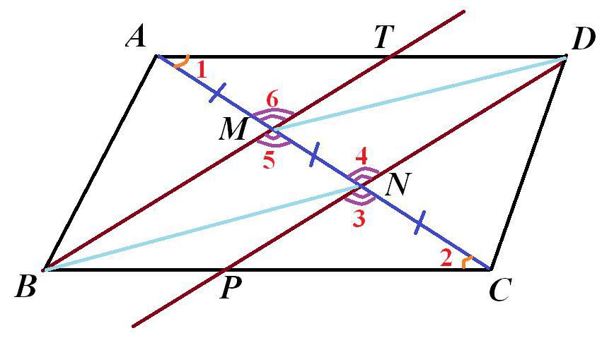3) Δ АМТ = Δ PNC (по стороне и прилежащим углам: АМ=NC, ∠1=∠2,
