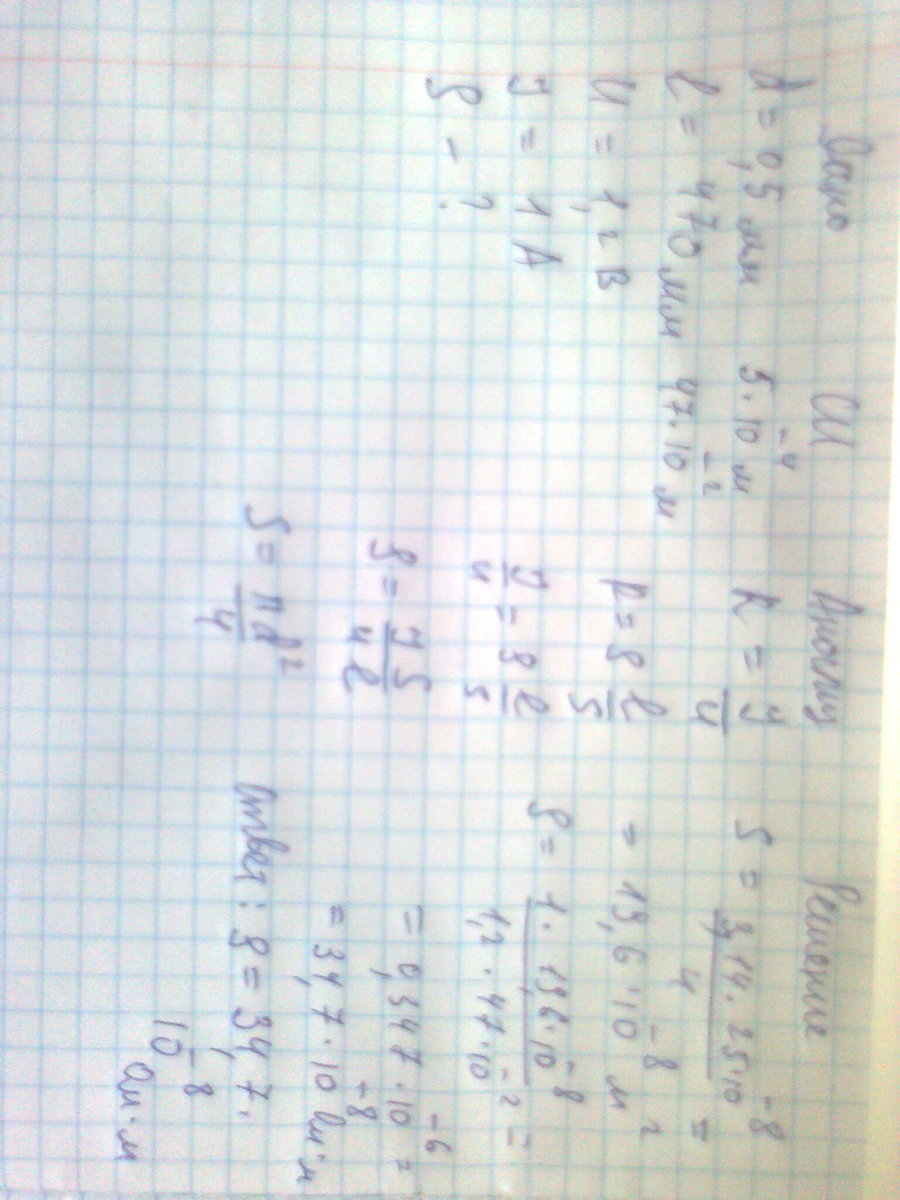 при включении в электрическую цепь проводника диаметром d=0,5 мм и длиной l=470 мм разность потенциалов на концах проводника оказалось равной U=1,2 В при силе тока в цепи I=1А. Определите удельное сопротивление p материала проводника