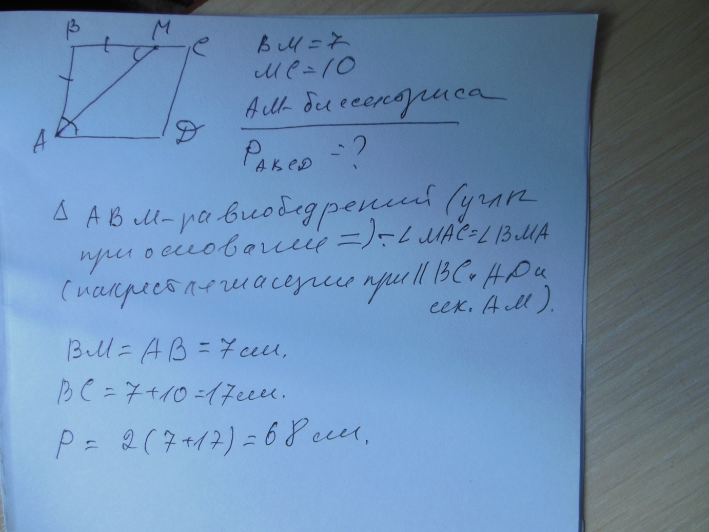Бісектриса гострого кута паралелограма поділяє сторону на відрізки завдовжки 7см і 10 см, починаючи від вершини тупого кута. Знайти периметр паралелограма.