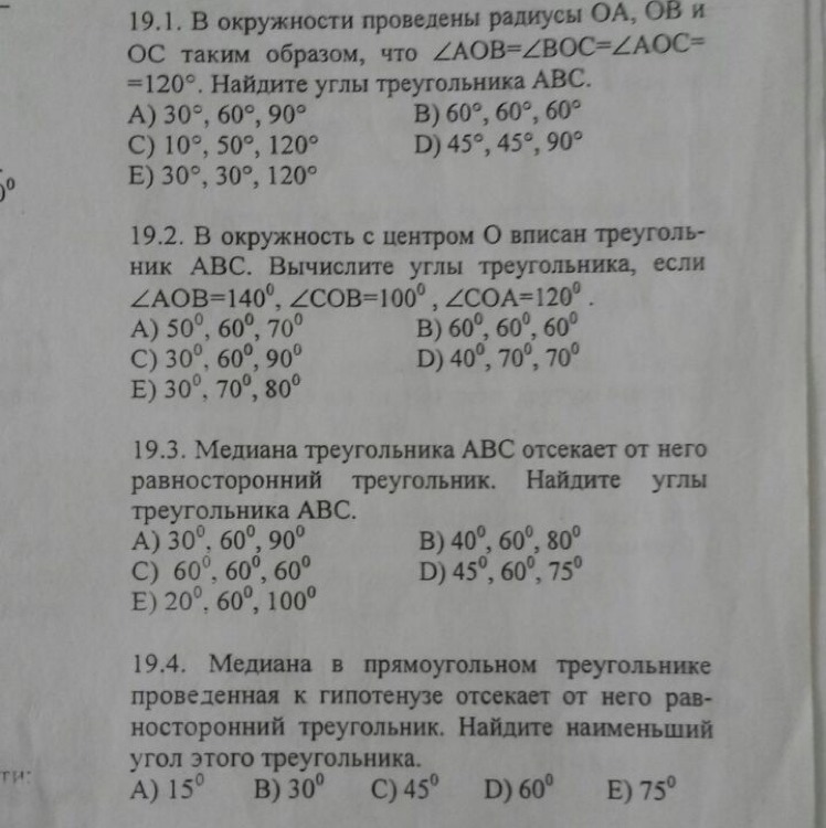 В двух последних задачах речь идет о прямоугольном треугольнике в котором медиана к гипотенузе равна ее половине. Один угол 90°, другой 60°, а третий 30°.