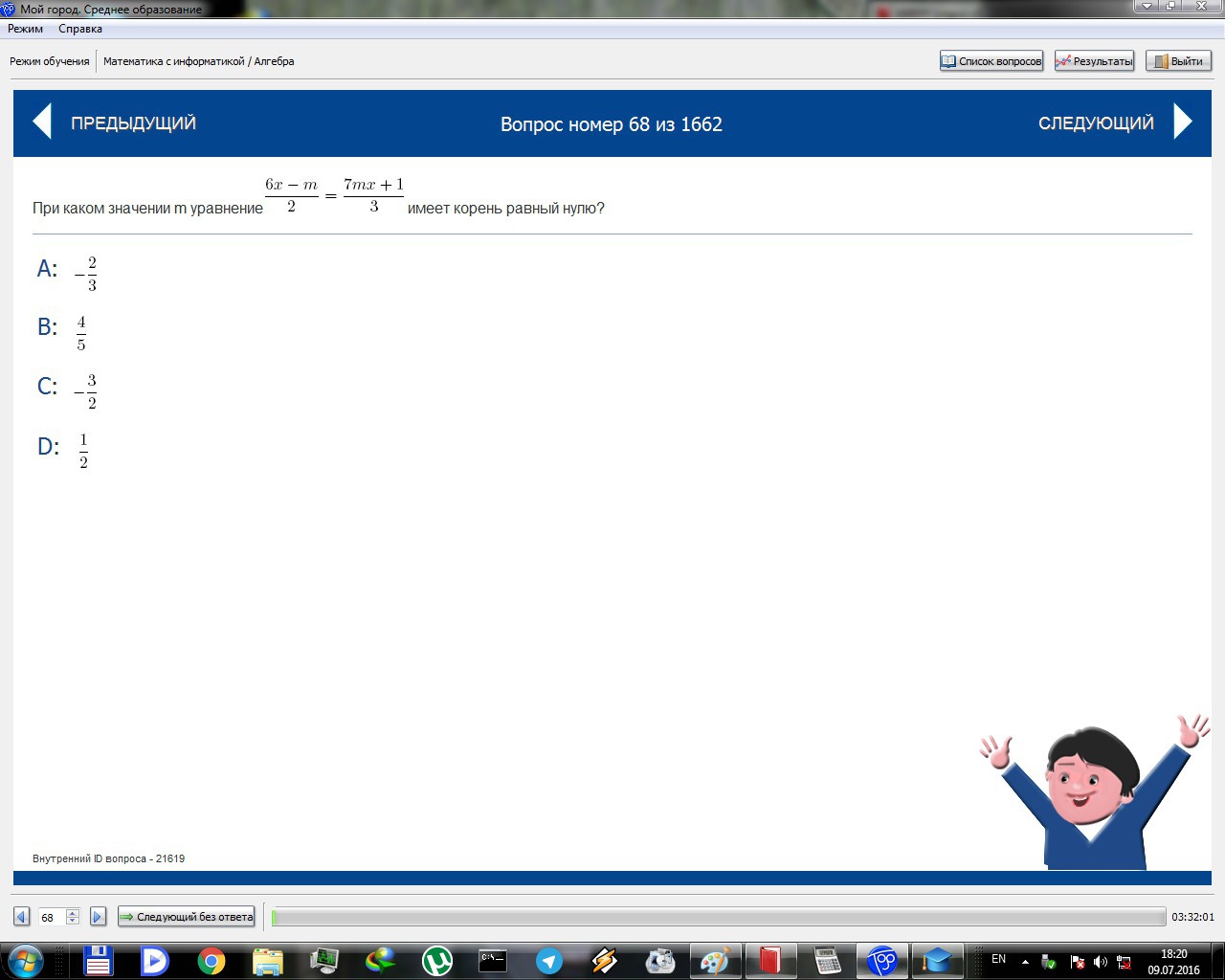 -m/2 = 1/3, m= 1/3 : (- 1/2), m= - 2/3 Ответ : А