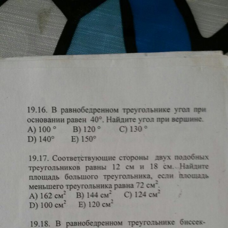 Значит угол при вершине будет равен 180-(40*2)=100 и это ответ А