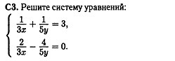 *первое уравнение:(1/3х)+(1/5у)=3; второе:(2/3х)-(4/5у)=0.