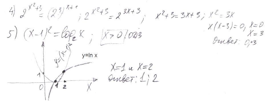 второе уравнение решаем графическим способом, построим параболу y=(x-1)^2 и график функции y=ln x (по основанию 2)