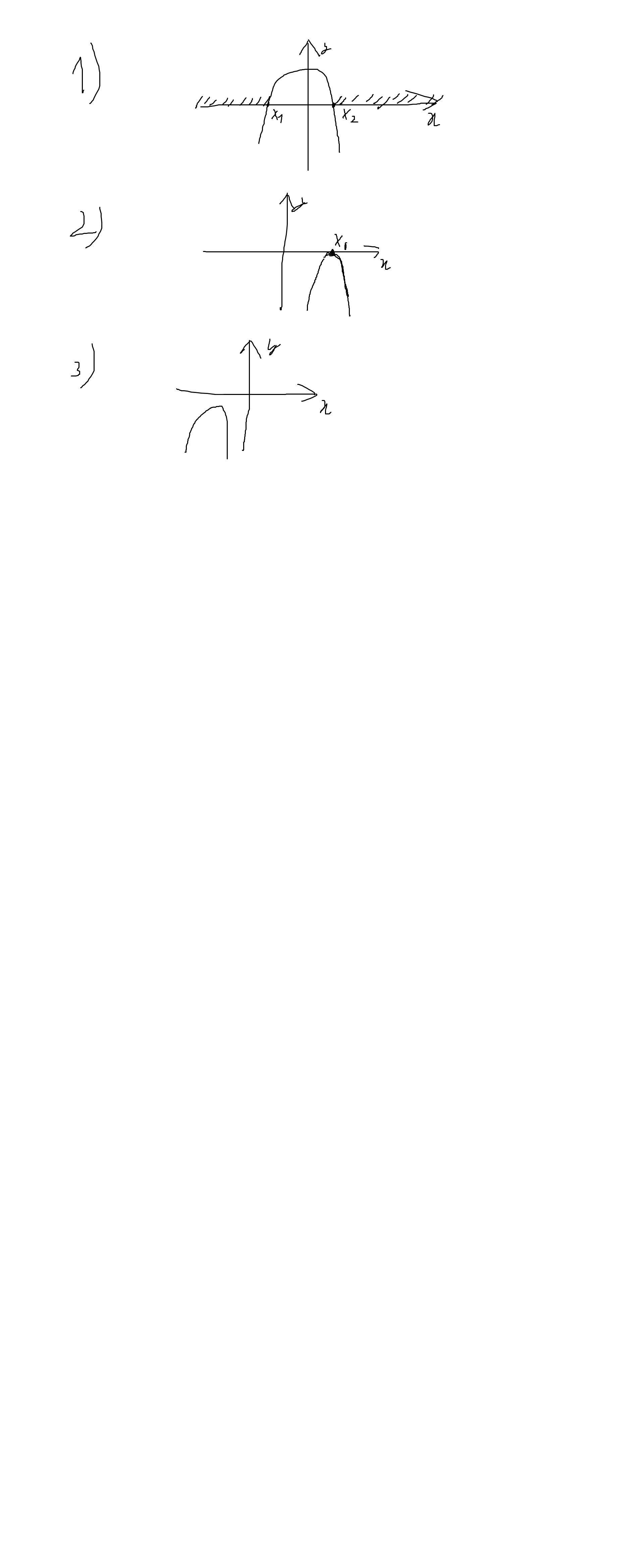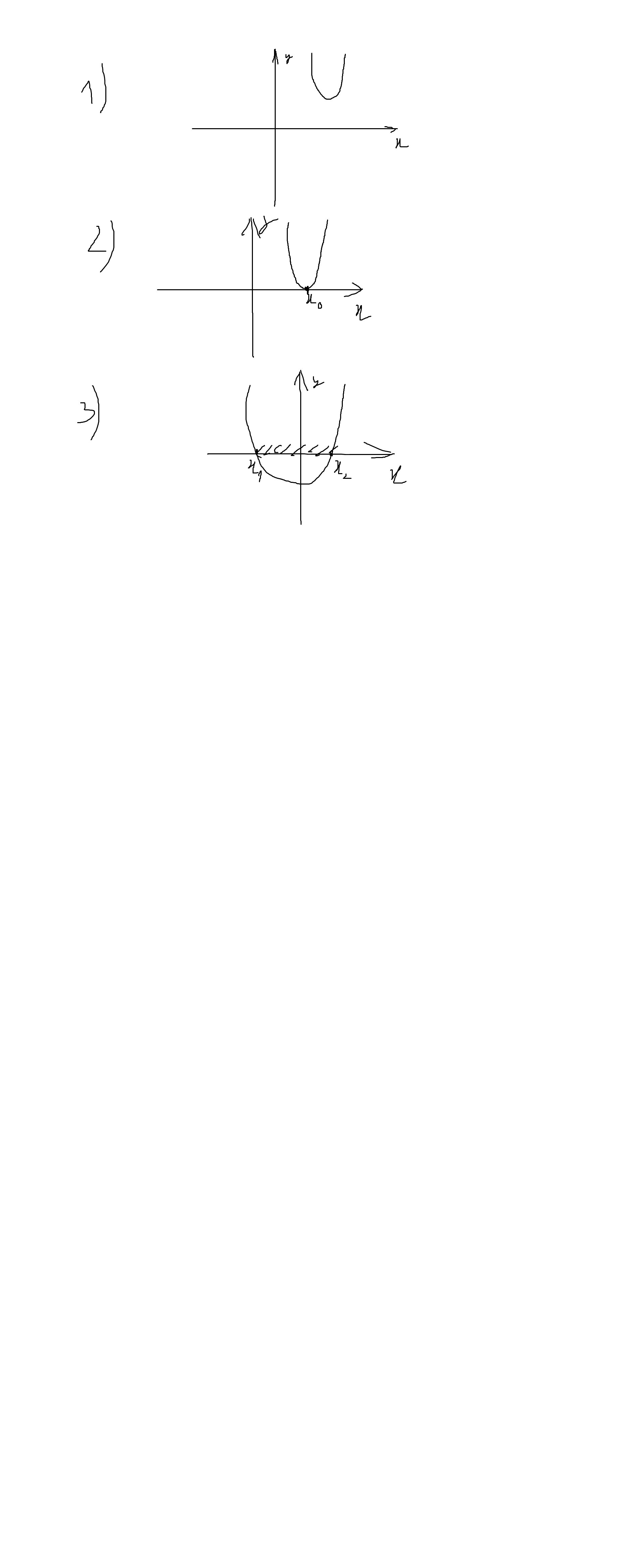 а)Пусть b + 2 > 0, b > -2, то есть ветви параболы задающей левую часть неравенства, направлены вверх. Теперь поиграемся с самой параболой, её точное положение мы не знаем, так что будем двигать её. Вот так, как на первых трёх фотографиях. Очевидно, что двигать её будем именно так. Это три основных случая, которые мы рассматривали тогда, когда учились решать такие неравенства. Двигать параболу по горизонтали нам смысла нет, так как множество решений зависит именно от расположения параболы относительно оси OX. Корни x1,x2 - это корни квадратного трёхчлена(помните, вначале мы находили корни левой части). Возникает вопрос. В случае направления ветвей вверх может ли быть такая ситуация, что квадратный трёхчлен отрицателен для всех x(то есть, для всех y парабола ниже оси OX). Смотрим, в первом случае наше неравенство вообще решений не имеет(вся парабола выше оси OX). Во втором случае аналогично(есть лишь одна точка, где многочлен равен 0 - это x0, но точек, где парабола ниже оси OX, то трёхчлен отрицателен, нет).