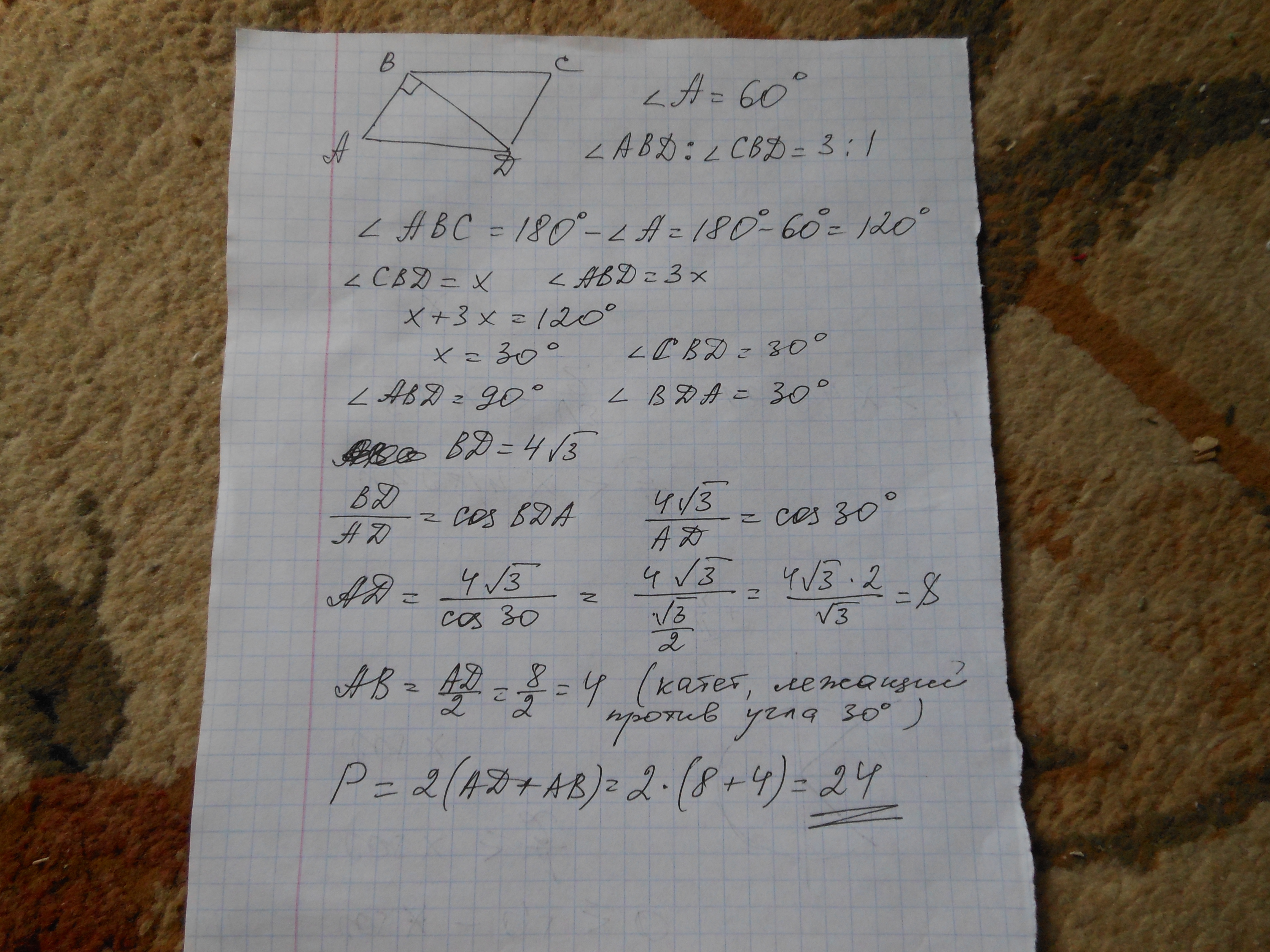 В параллелограмме острый угол равен 60 градусам, а диагональ делит тупой угол в отношении 3:1. вычеслить периметр параллелограмма, если его меньшая диагональ равна 4√3 см