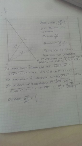 Итак, АС:ВС=(3х√10):(9х√10)=1:3 - это ответ.
