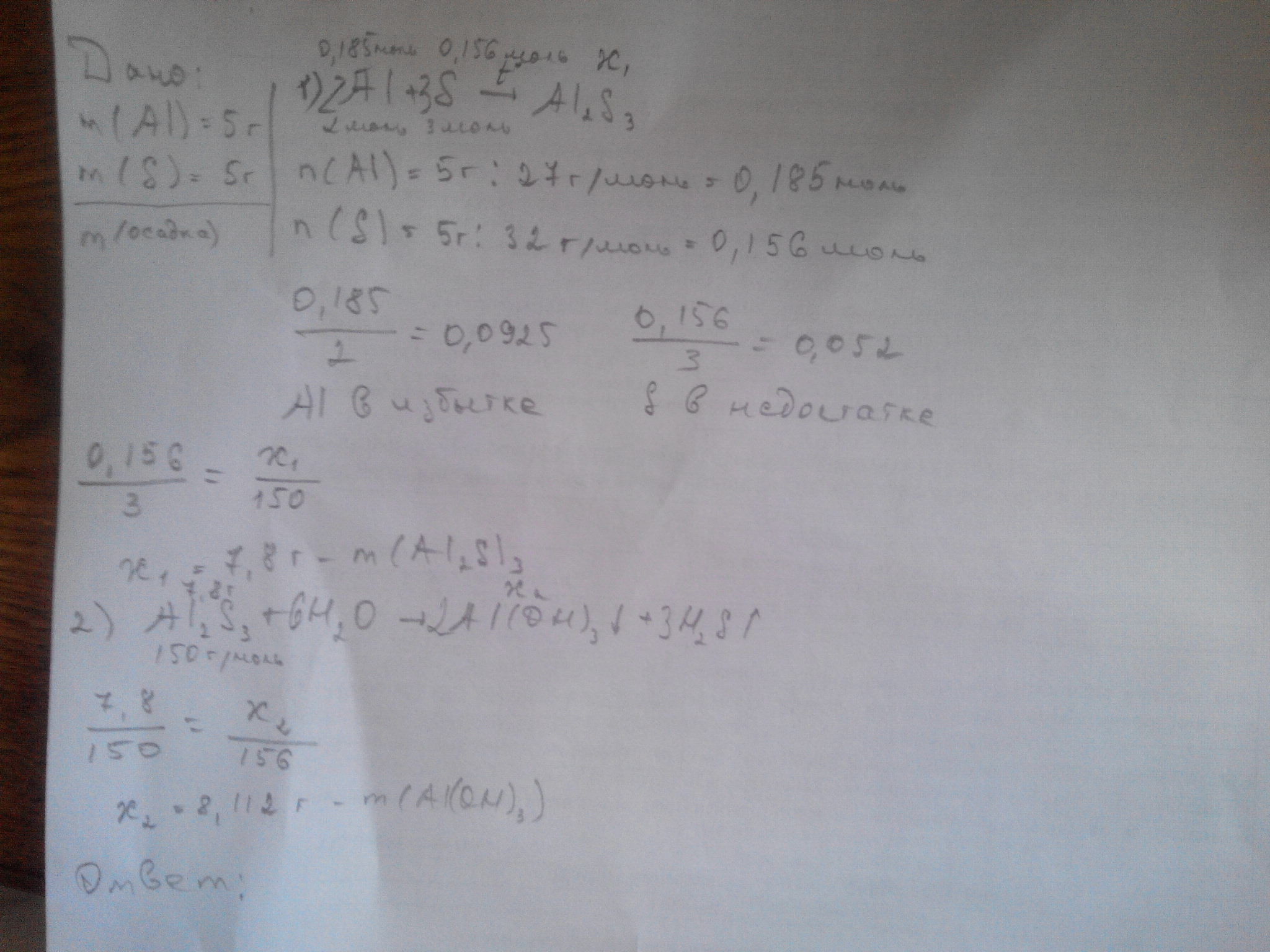 Сплавили 5г алюминия и 5г серы.полученный сплав обработали водой.вычислить массу твердого