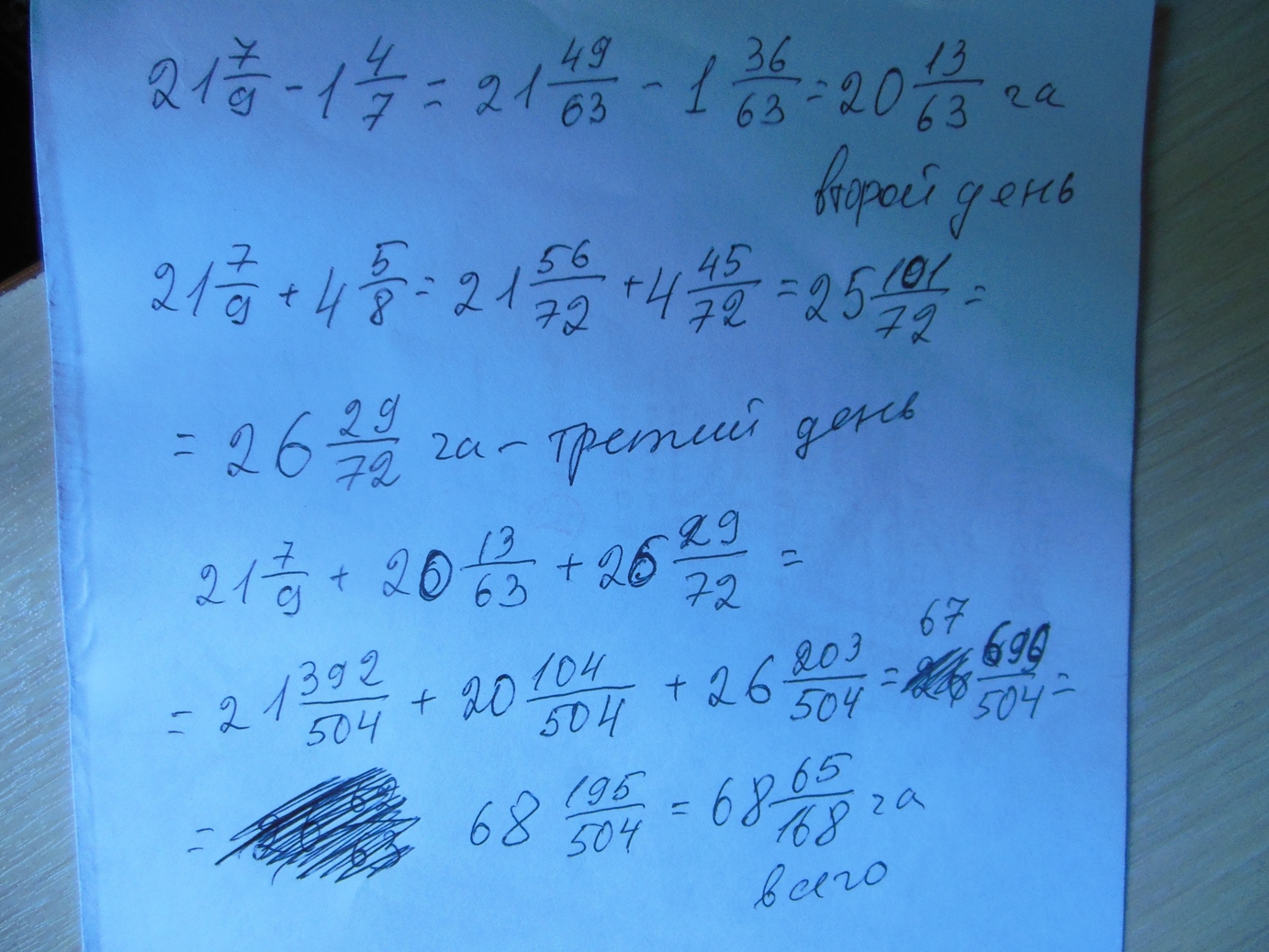 2) 21 7/9 + 4 5/8 = 21 56/72 + 4 45/72 = 25 101/72 = 26 29/72 ( га ) в третий день