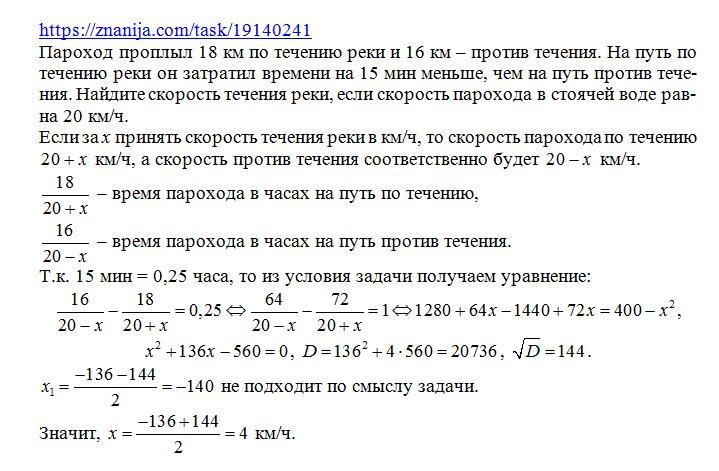 Пароплав проплив 18 км за течією річки і 16 км проти течії. на шляху за течією річки він затратив часу 15 хв менше ніж на шлях проти течії. Знайдіть швидкіть течії річки, якщо швидкіть пароплава у стоячій воді дорівнює 20 км/год