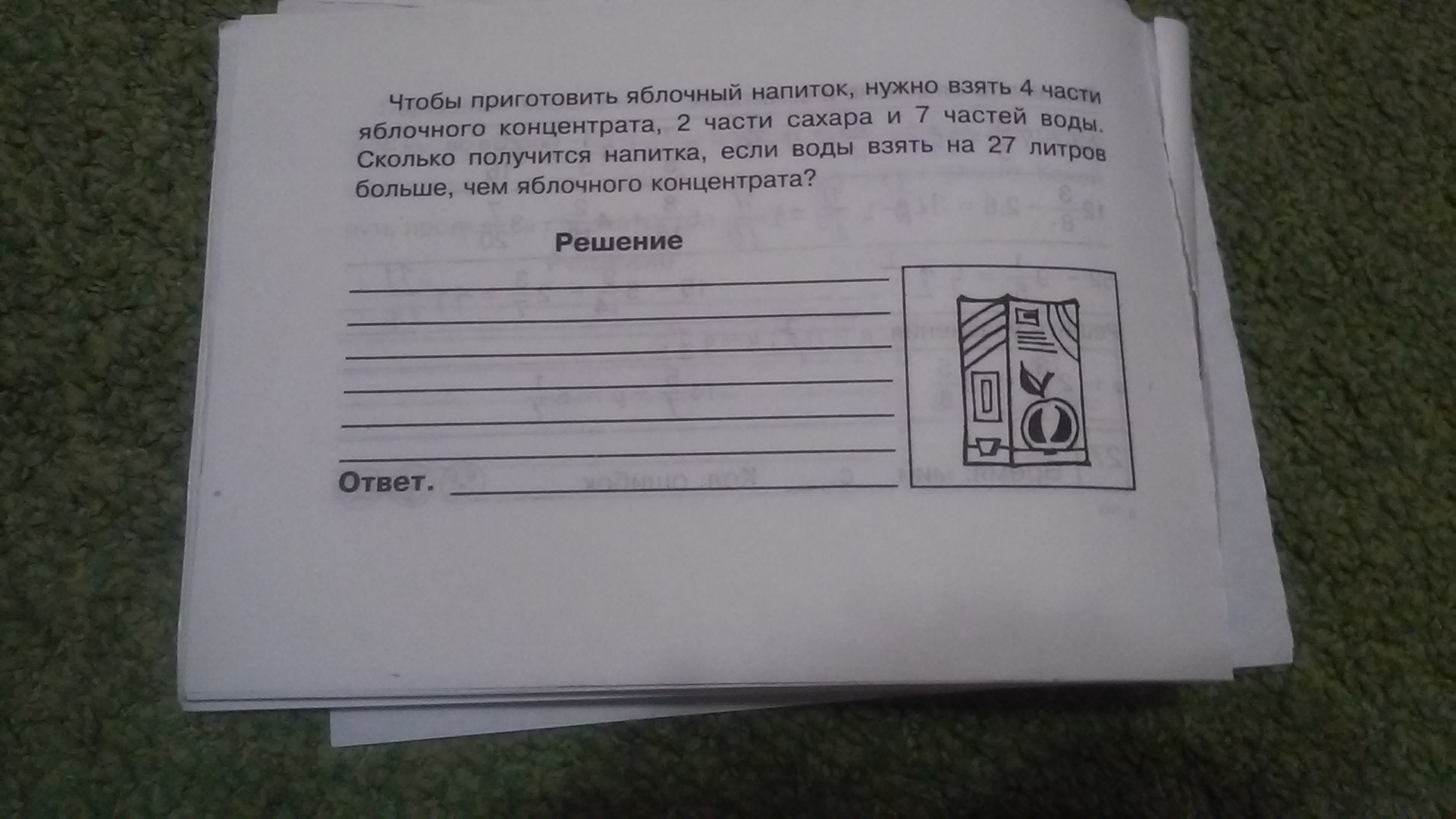 Сложим все части и получим, что чтобы приготовить напиток нужно 13 частей (всего). Воды нужно на 3 части больше, чем яблочного концентрата (7-4=3). Это и есть 27 литров. Обозначим 1 часть за х.