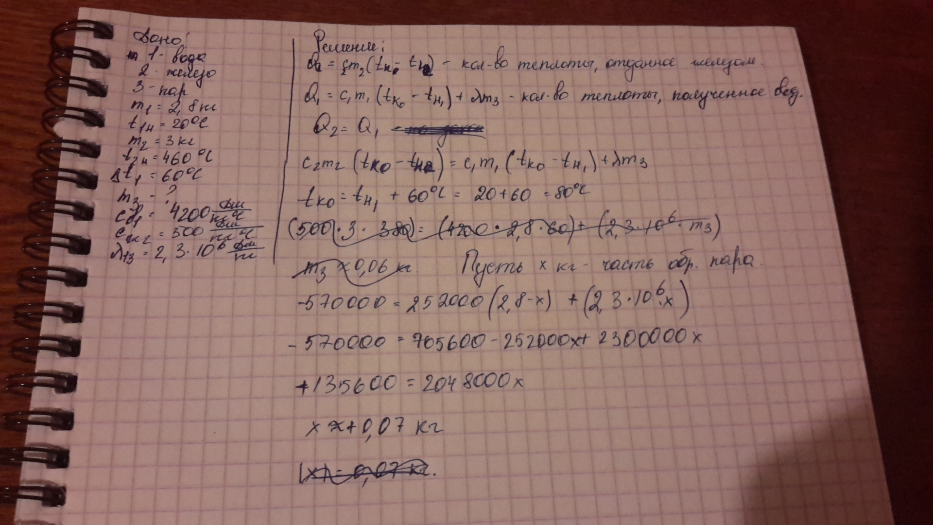 в калориметр ,в котором находилось 2,8 кг воды при t=20°С ,бросили кусок железа массой 3 кг ,нагретый до 460°С.Часть воды обратилась в пар ,а оставшаяся вода нагрелась до 60°С .Определите массу испарившейся воды .Терлоёмкостью калориметра пренебречь.Удельная теплоёмкость воды 420х Дж/кг*°С,железа 500 Дж/кг*°С,Удельная теплота парообразования воды 2,3 МДж/кг.