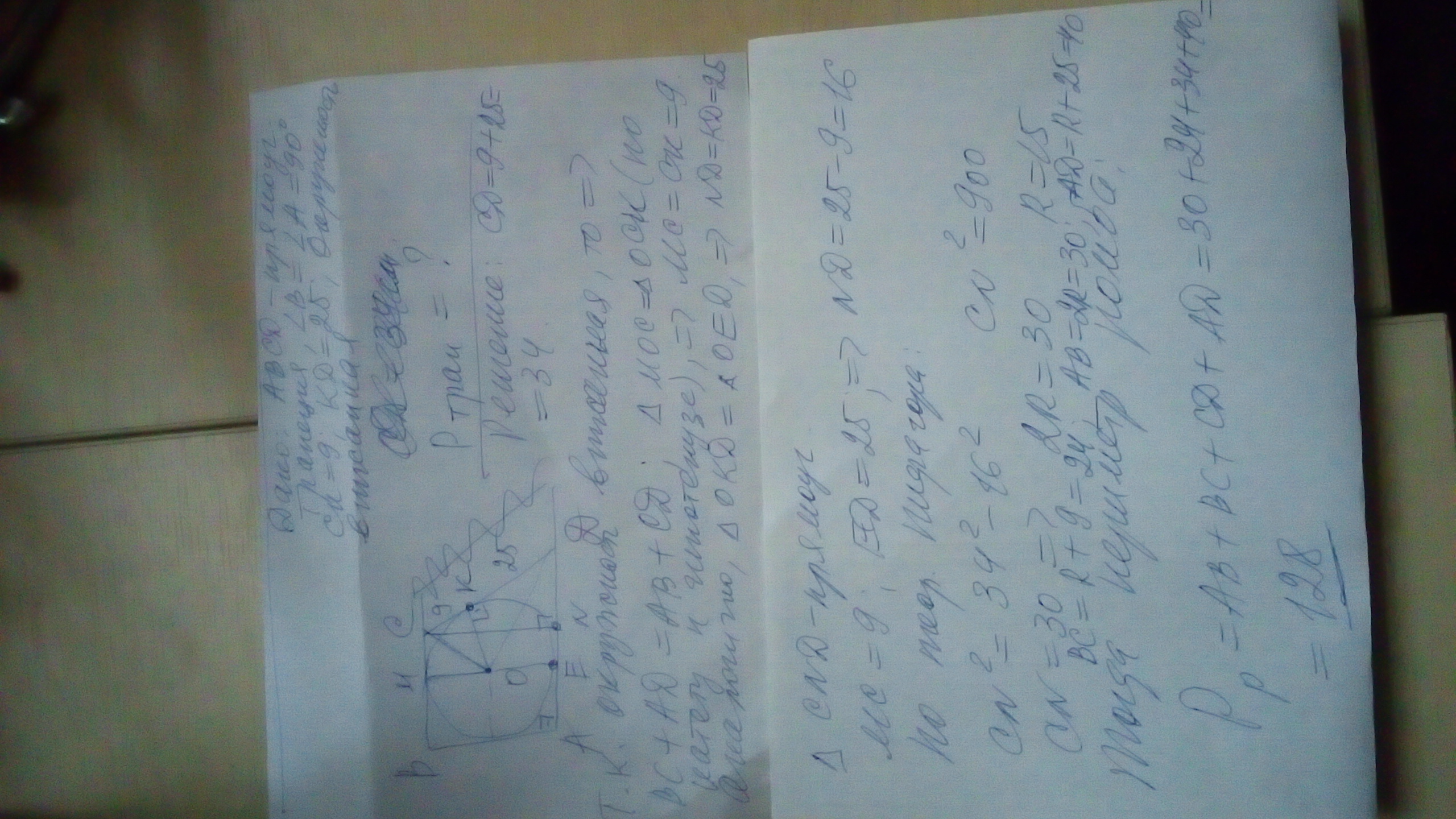 У прямокутній трапеції одна з бічних сторін поділяється точкою дотику вписаного кола на відрізки 9 см і 25 см.Знайти периметр трапеції