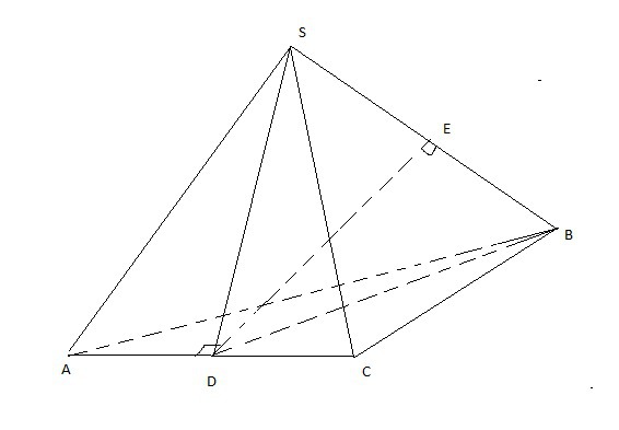 Рассмотрим равнобедренный треугольник SDB. DE - высота треугольника SDB. BE=a/2. Тогда из прямоугольного треугольника DEB: DE=√(BD²-BE²)=√((a√3/2)²-(a/2)²)=a√2/2.