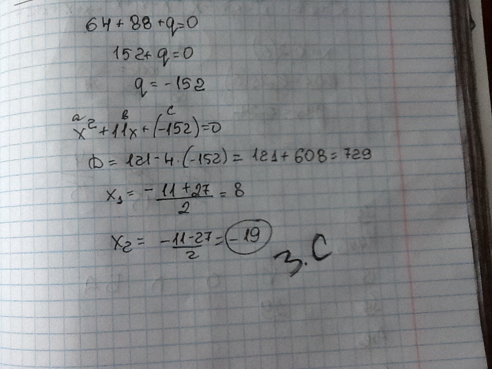 Один из корней квадратного уравнения х2 + 11х + q = 0 равен 8. Найдите второй корень.