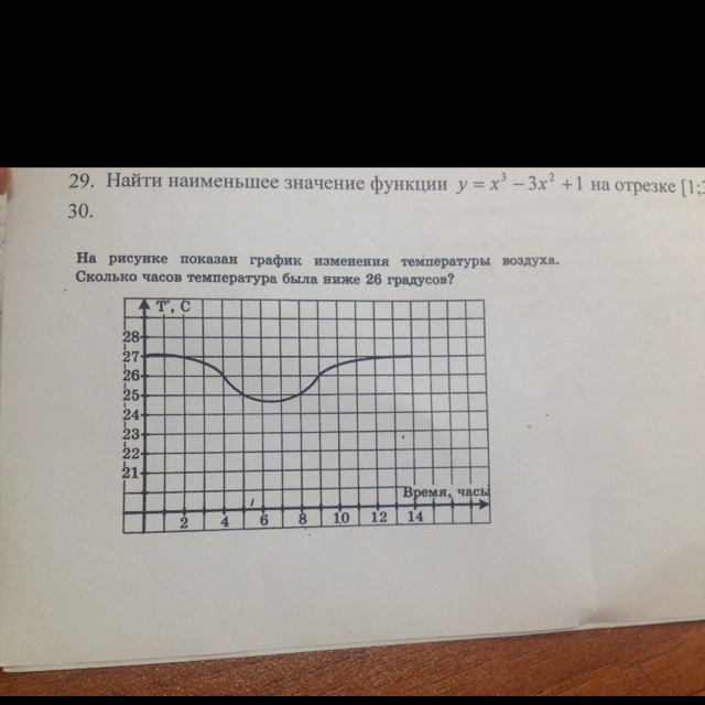 Нарисуй линию, параллельную оси абсцисс, на уровне 26 градусов. Ты увидишь, что график функции, если смотреть по часам, будет ниже этой линии на промежутке с 4 часов до 9 часов. Следовательно, ответ 9-4=5 часов.