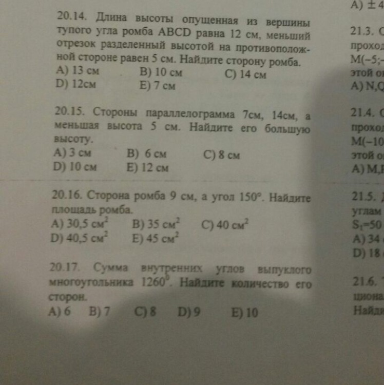 1) - a. Один катет равен 12, другой 5. Гипотенуза равна 13. 2) - д. Меньшая высота проведена к большой стороне. (5*14)/7=10. 3) - д. Меньший угол равен 30. Проведем высоту из тупого угла. Против угла 30 градусов лежит катет, равный половине гипотензы=9/2=4,5. Площадь 4,5*9=40,5. 4) - д. (н-2)*180=1260. н=9. сколько углов, столько и сторон.
