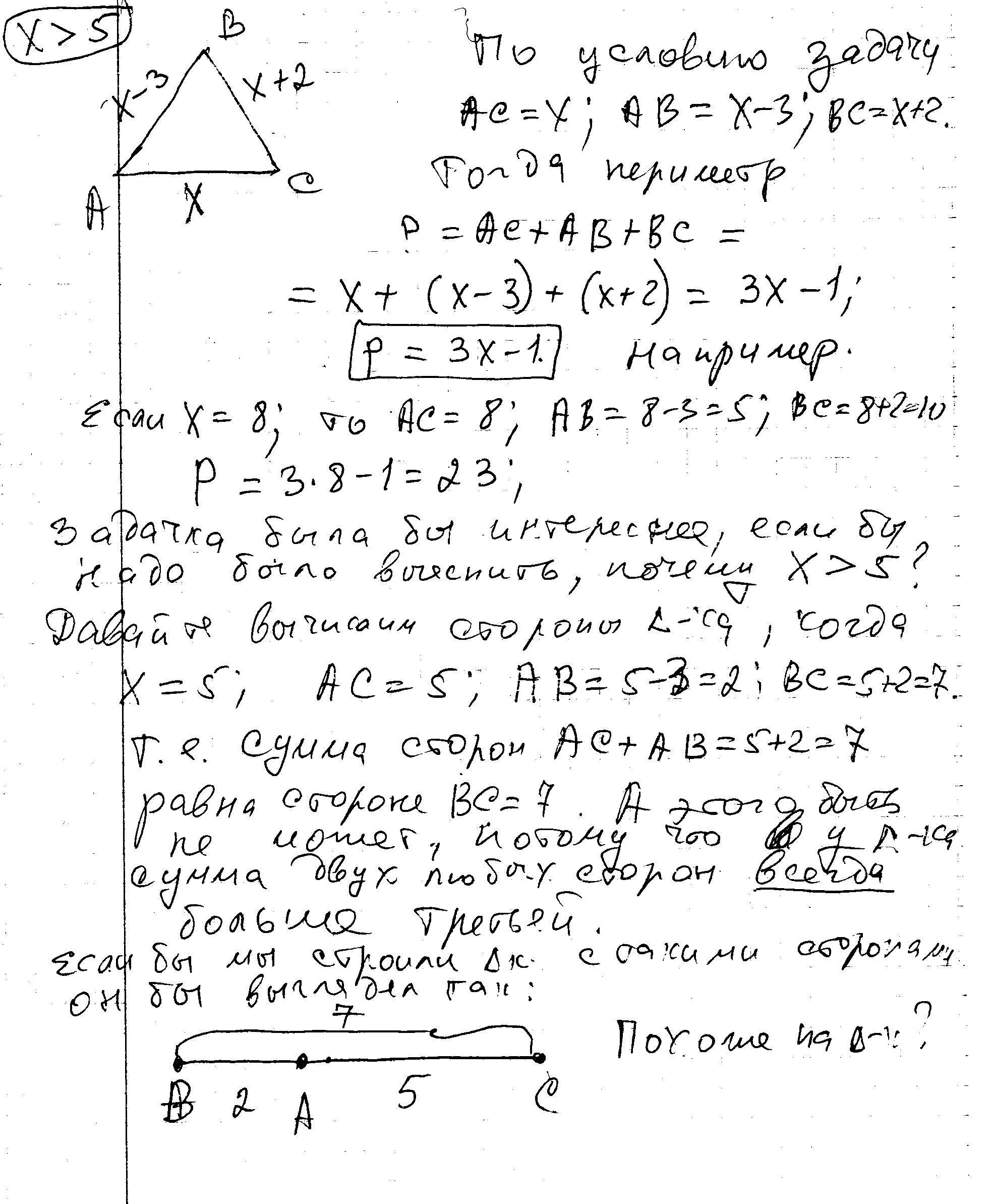 Помогите пожалуйста решить!! Одна сторона треугольника x(x>5) см, вторая на 3 см меньше, а третья на 2 см больше первой. Найдите периметр этого треугольника. Обьснение можно чуть подробней человеческими словами) Спс заранее)