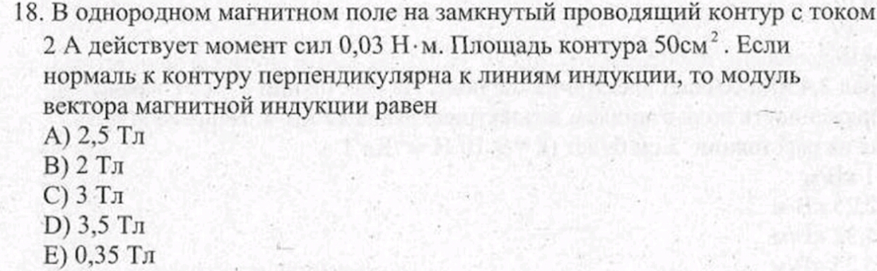 в однородном магнитном поле на замкнутый проводник с током 2А действует момент сил 0.03 Н*мне. Площадь контура 50 см^2. Если нормаль к контуру перпендикулярна к линиям индукции , то модуль вектора магнитной индукции равен