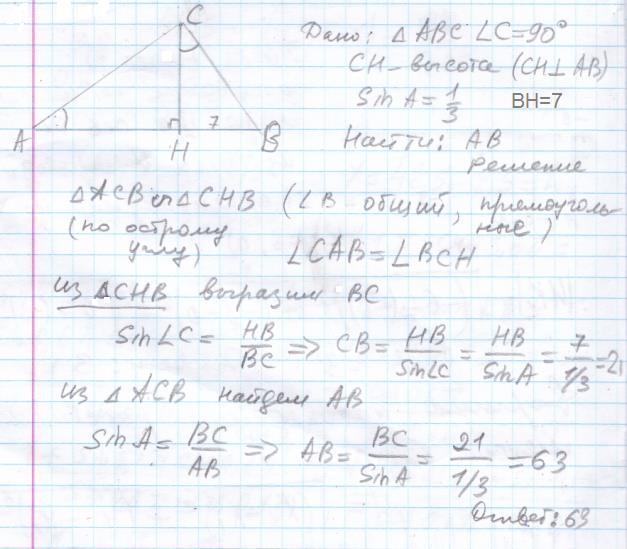 В треугольнике ABC угол C = 90º, CH - высота, BH = 7, sin A = 1/3. Найдите AB.