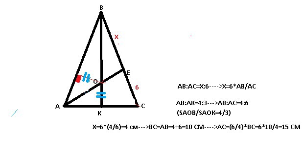 В равнобедренном треугольнике ABC ( AB = BC ) биссектриса угла А пересекает высоту BK в точке О, а сторону BC в точке E. Найдите длину стороны AC, если BO / OK = 4 / 3 и EC = 6 см. Помогите!!