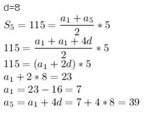 Різниця арефметичної прогресії дорівнюе 8 , сума перших її п'яти членів дорівнює 115. Знайти a1,a5