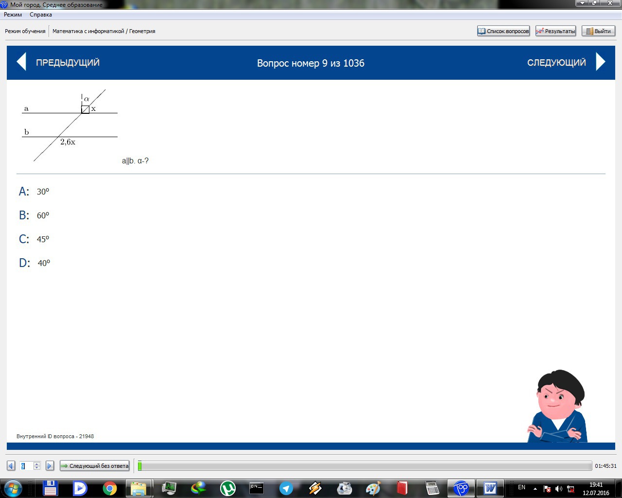 Угол, который под углом х, равен 2,6 х, так как угол, который еще ниже, короче, они с ним соответственные. Из рисунка видно, что пересекающий отрезок составляет с углом х с углом 2,6 х, который выше, 180°; значит, 2,6х+х=180; 3,6х= 180; х=50.