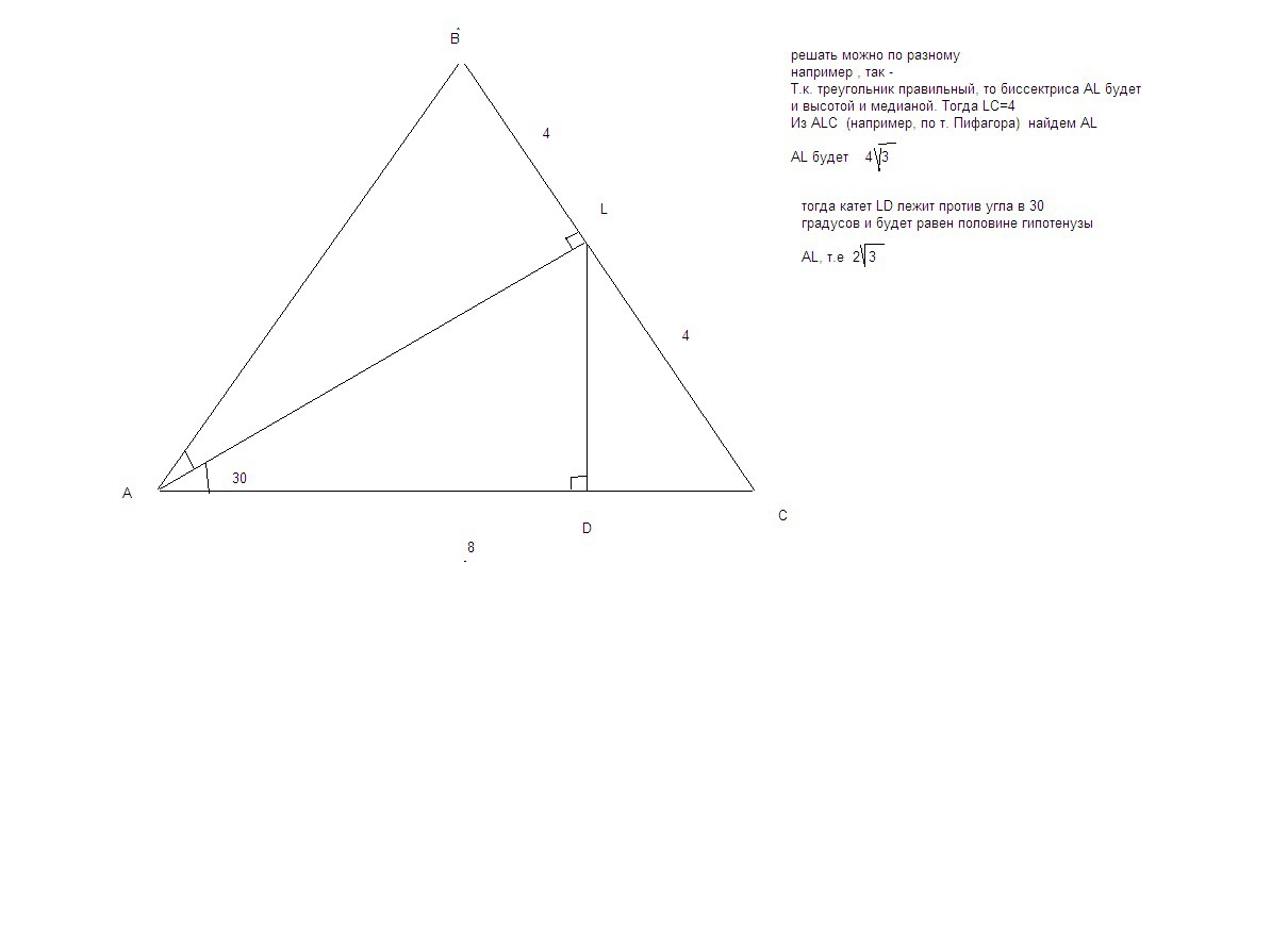 В правильном треугольнике АВС со стороной 8 проведена биссектриса AL . найти расстояние от L до стороны AC