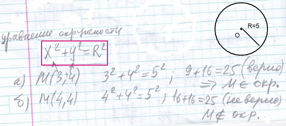 применяем уравнение окружности с центром в начале координат и подставляем по очереди координаты данных точек и проверяем равенство (если равенство выполняется, то точка принадлежит и обратное)