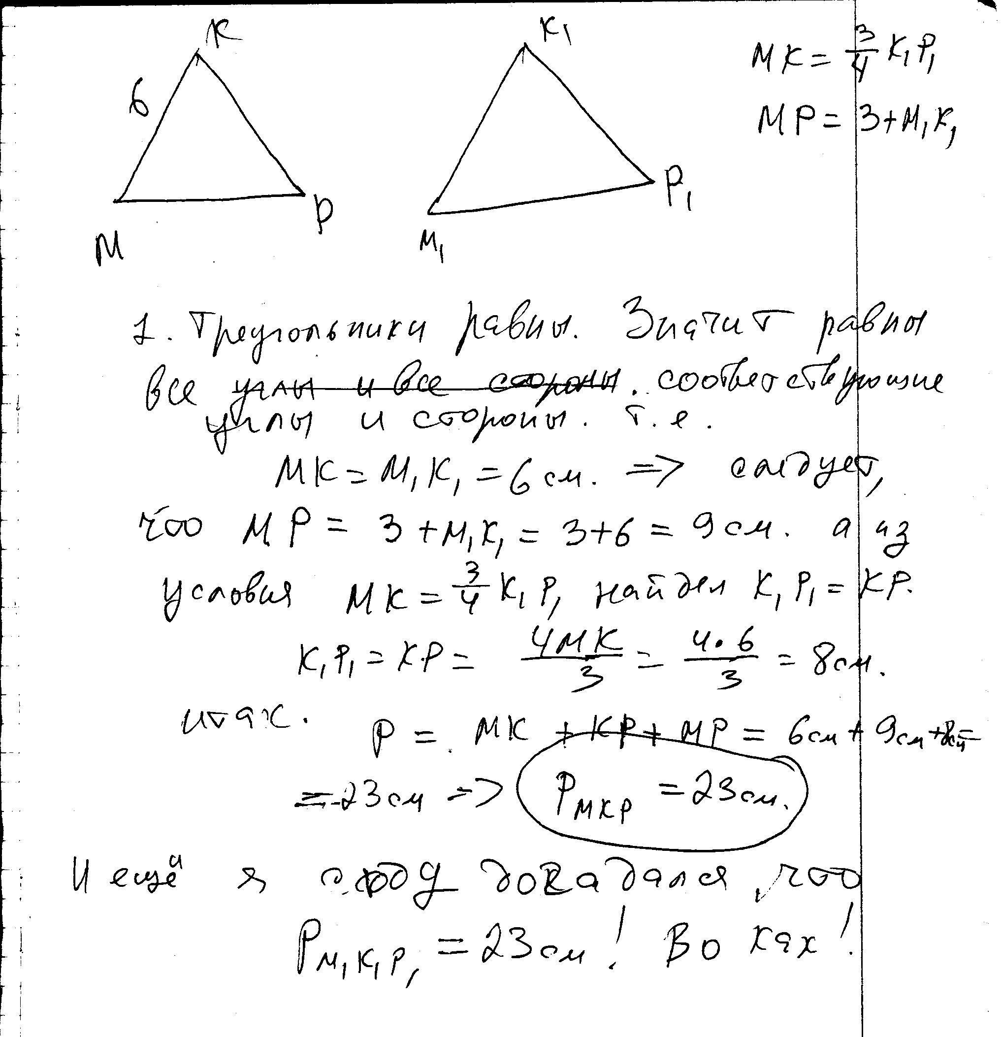 Известно, что треугольник МКР = треугольнику М1К1Р1, причём угол М= углу М1, угол К= углу К1. Найдите периметр треугольника МКР, если МК = 6 см и составляет три четверти отрезка К1Р1, а отрезок МР на 3 см больше М1К1.