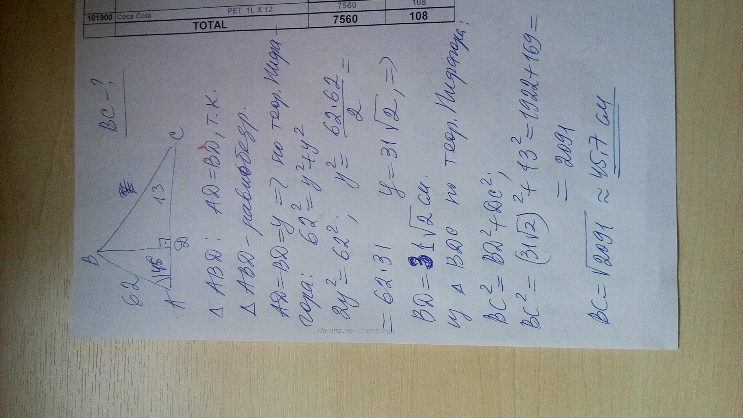 У трикутнику АВС висота ВD поділяє сторону АС на відрізки AD і DC, 45 A°, АВ=62см , DC=13cм . Знайдіть сторону ВС трикутника.