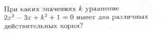 Для получения двух корней необходимо, чтто бы дискриминант был больше нуля: 9-8*(k²+1)=9-8-8*k²⇒1-8*k²>0⇒1>8*k²⇒k²<1/8⇒k<1/√8⇒|k|<0,353, то есть -0,353<k<0,353