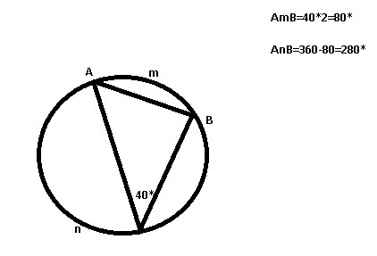 хорда AB окружности видна из любой точки одной из дуг на которые делит хорда окружност под углом 40Градусов. Чему равны дуги на которые точки A и B разделили окружность?
