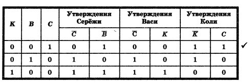ДЛЯ РЕШЕНИЯ ЗАДАЧИ НУЖНО СОСТАВИТЬ ТАБЛИЦУ ЧЕСТНОСТИ(я её прикрепил) В КОТОРОЙ ПРЕДСТАВИТЬ ВЫСКАЗЫВАНИЯ КАЖДОГО МАЛЬЧИКА! РЕШЕНИЕ!!: Пусть К = "Коля съел конфеты", B = "Вася съел конфеты", С="Сережа съел конфеты". Так как конфеты съел один из мальчиков, то чтобы выяснить, кто это сделал, достаточно фрагмента таблицы истинности, содержащего наборы значений входных переменных 001, 010, 100.