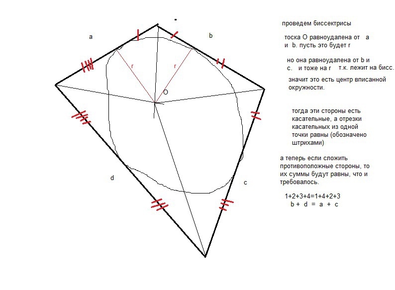 Биссектрисы всех углов выпуклого четырёхугольника со сторонами а,b,c и d (находятся по часовой стрелке) пересекаются в одной точке. Докажите, что a+c=b+d.