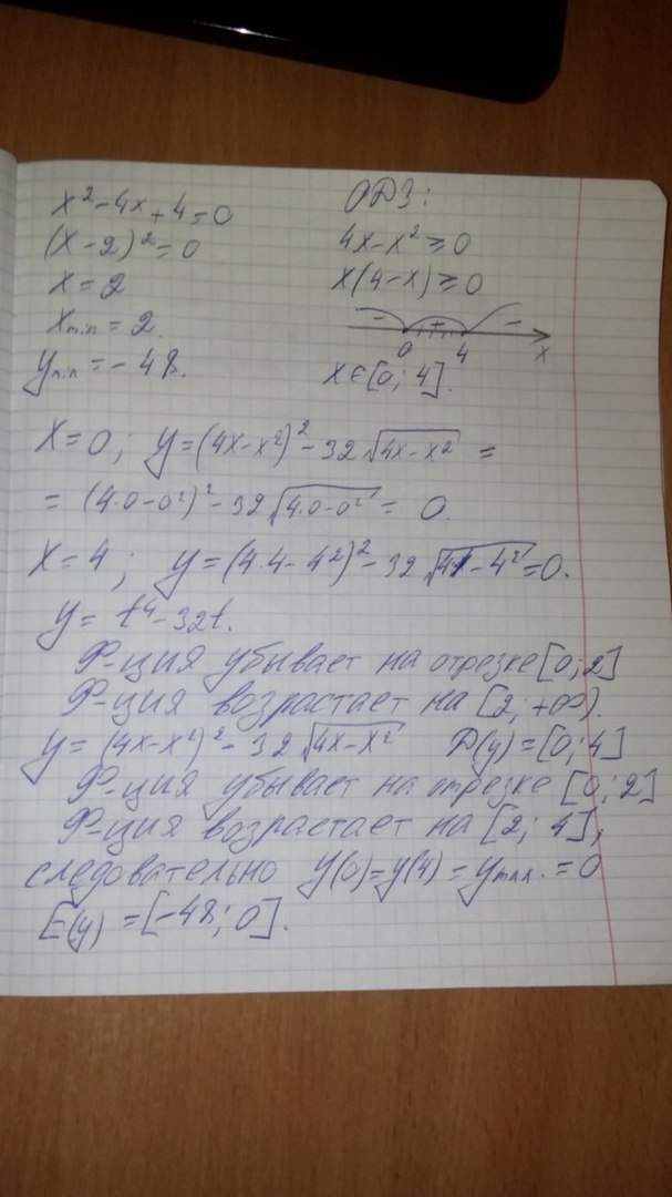 Итак получаем, что функция у=(4х-х²)²-32√(4х-х²) изменяется от -48 до 0.