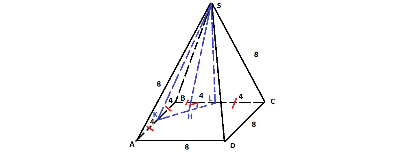 SL=SK=√(SB²-AK²)=√(8²-4²)=√48=4√3