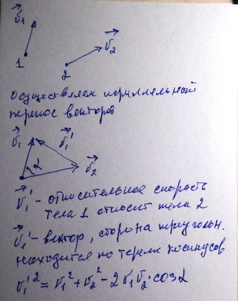 Как находить относитиленую скорость двух тел ,движущихся под определенным углом? Например:движутся два самолёта со скоростями V1 и V2 под углом A друг к другу. Найти скорость второго самолёта относительно первого