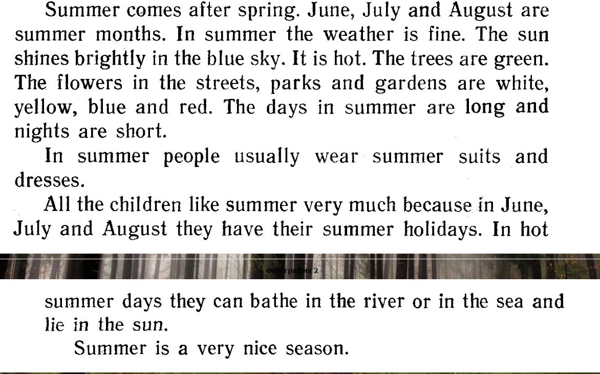 Лето приходит после весны.Июнь, июль и август-летние месяцы. Летом хорошая погода. Солнце светит ярко в голубом небе.Оно очень горячее. Деревья зеленые. Цветы на улицах, в парках и садах белые, желтые, синие и красные. Дни летом длинные и короткие ночи. Летом люди обычно носят костюмы и летние платья.Все дети, очень любят лето,потому что у них есть летние каникулы.В жаркие летние дни они могут купаться в реке или в море и лежать на солнце. Лето очень хороший сезон.