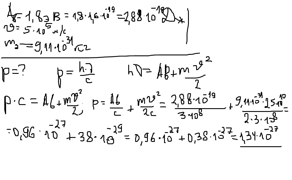 Работа выхода электрона из цезия 1,8 эВ, скорость фотоэлектронов 5*10^5 м/с. Определите импульс фотонов, вызывающих фотоэффект