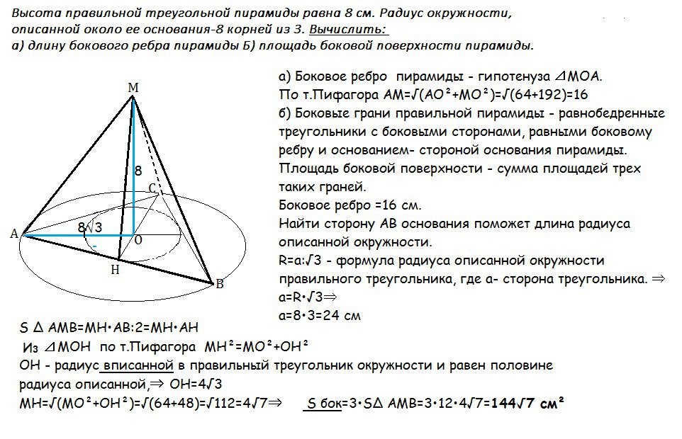 Высота правильной треугольной пирамиды равна 8 см. Радиус окружности, описанной около ее основания-8 корней из 3. Вычислить: а) длину бокового ребра пирамиды Б) площадь боковой поверхности пирамиды