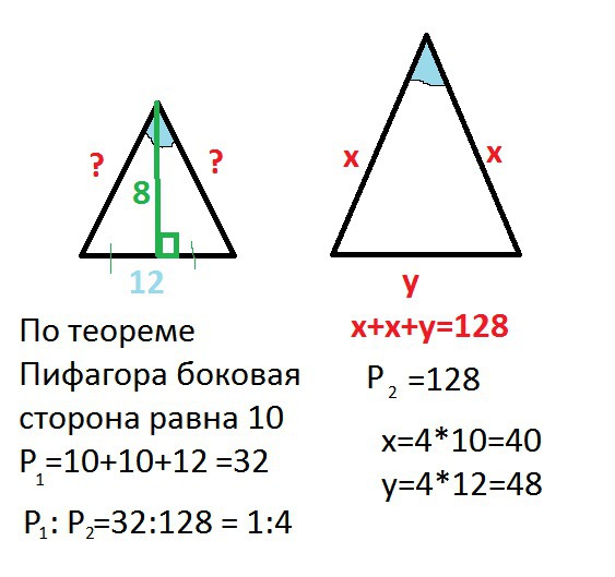 1. Два рівнобедрені трикутники мають рівні кути при вершинах, які протилежні основам. Основа першого трикутника дорівнює 12 см,а медфана, проведена до неї 8см. Знайдіть бічну сторону другого трикутника, якщо його периметр 128 см.