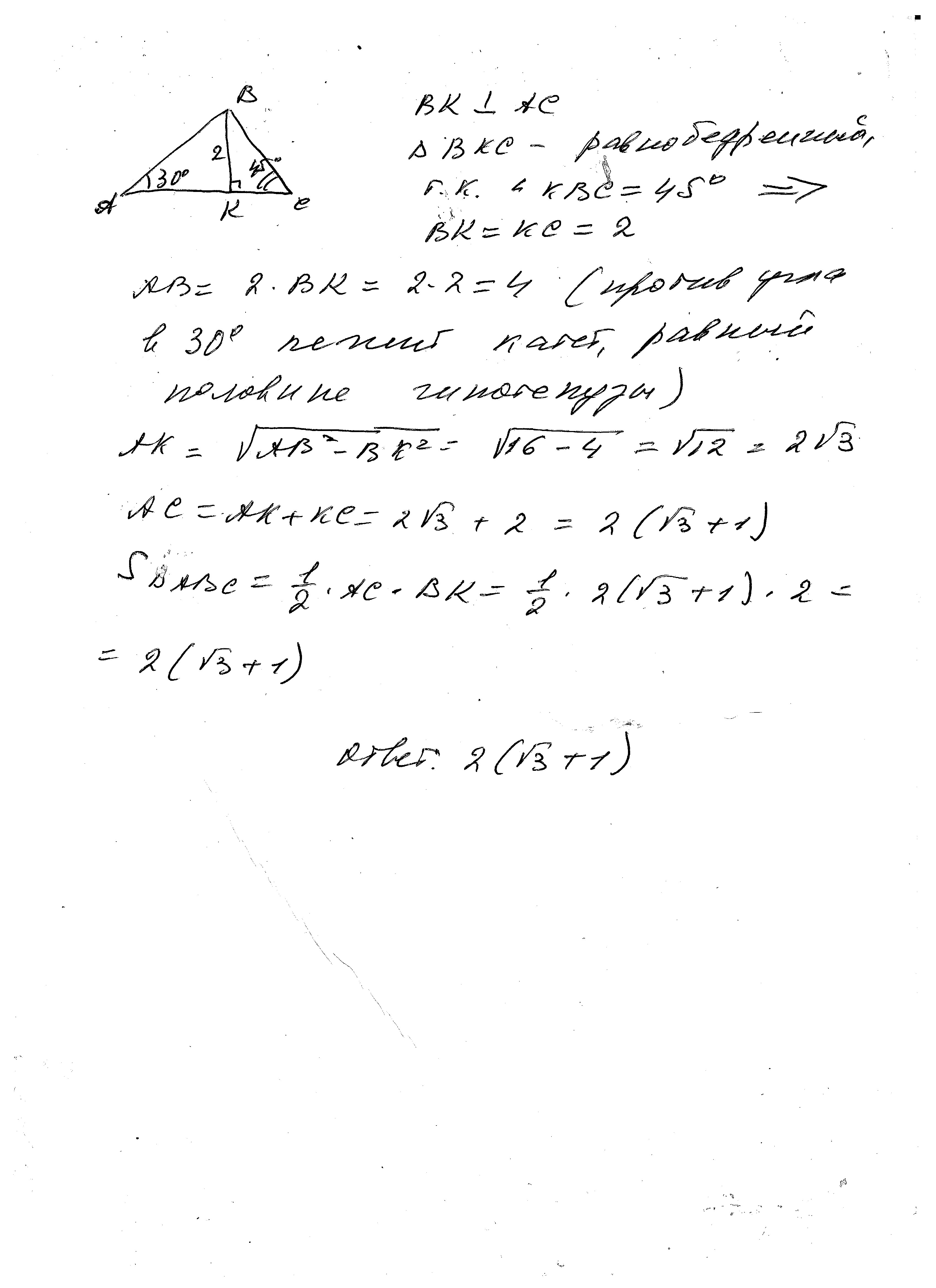 S(Δ АВС)=(1/2)·АВ·АС·sin∠A=(1/2)·4·2(√3+1)·(1/2)=2(√3+1) кв. ед.