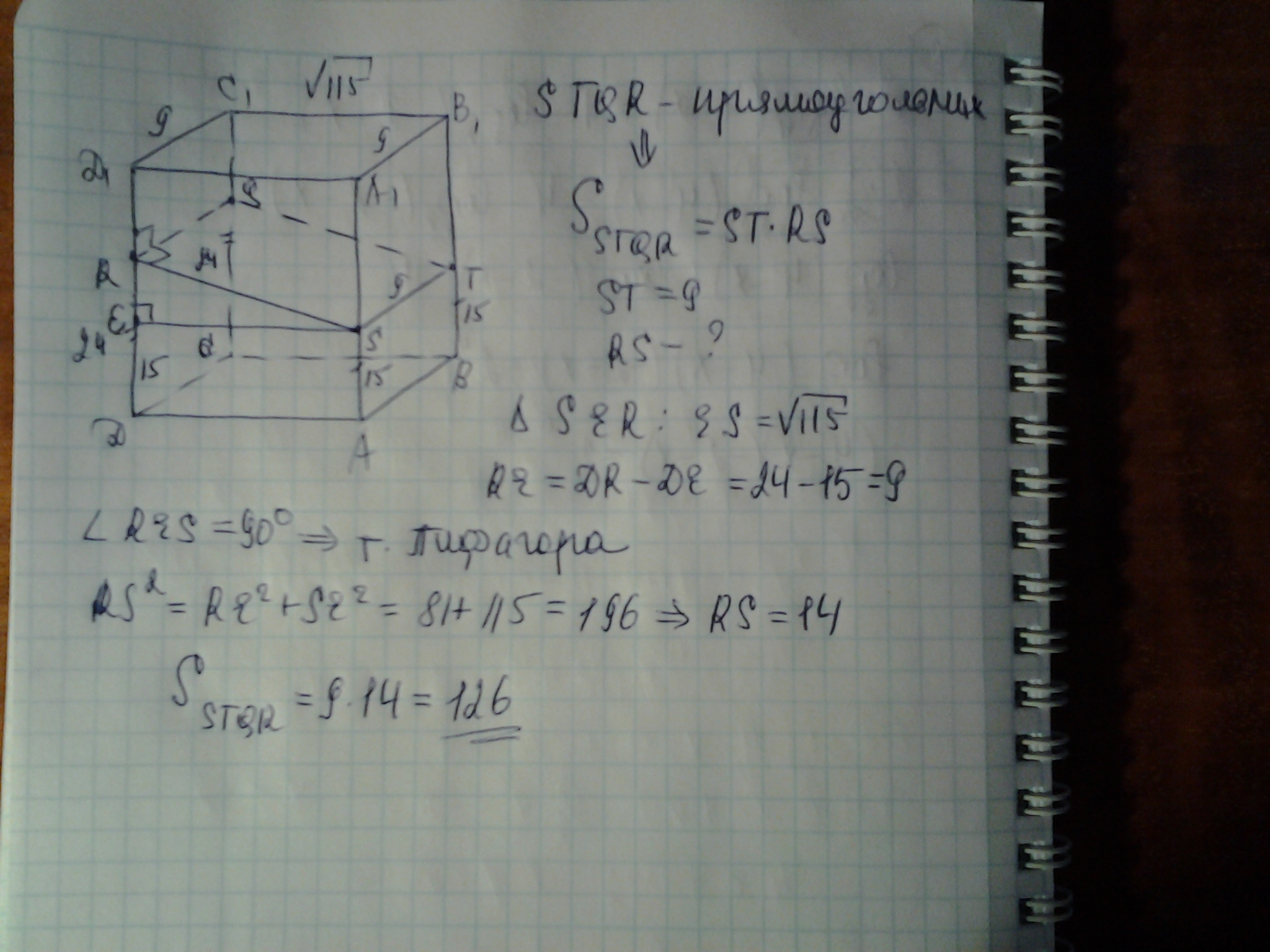 В прямоугольном параллелепипеде АВСDA1B1C1D1 на ребрах АА1 и ВВ1 отложены точки S и Т так, что AS=ВТ=15, а на ребрах DD1 и СС1 отложены точки R и Q так, что DR=CQ=24. Ребра С1D1=9, B1C1=корень из 115. Найдите площадь сечения STQR